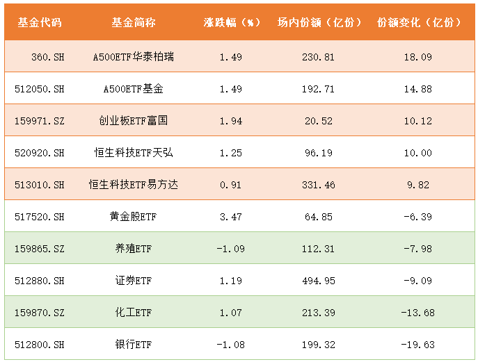 其中,股票类ETF是本周份额增长的主力,为总份额贡献63.29亿份。进一步看,本周股票ETF份额变动不大,有4只ETF份额增长超过10亿份,其中份额增长最多的A500ETF华泰柏瑞仅18.09亿份。