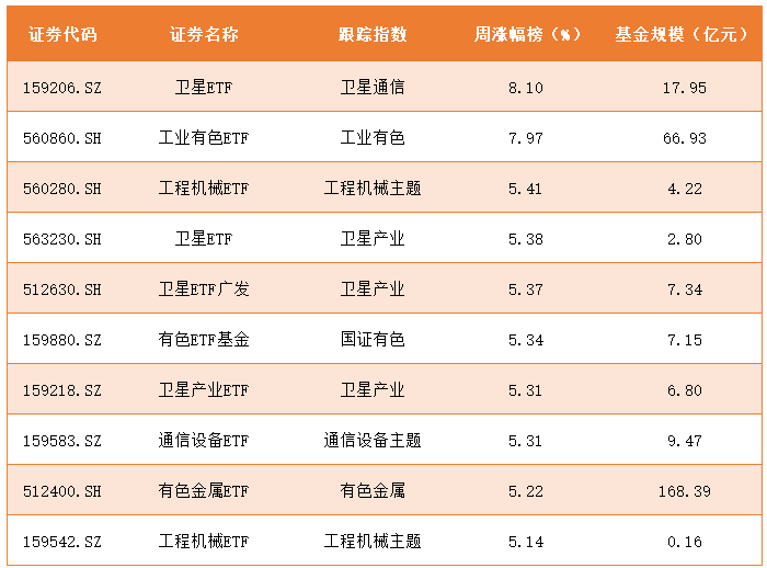 ETF涨幅榜方面,主要体现在三个主题,分别是工业有色、卫星通信、工程机械,相关10只标的入榜,平均周涨幅超过6%,详细表现大伙看下图:
