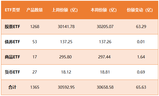 再来看本周ETF市场的动态,截至12月05日,全市场共有1365只ETF跟踪471只指数(未统计货币类),场内流动基金份额30658.58亿份,相比上周增加65.63亿份,详细数据如下图所示:
