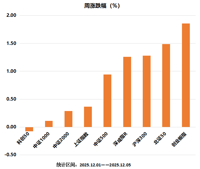 12月首周大A震荡上行,截至周五收盘各大宽基指数除科创50小幅下跌外其余指数全线上涨,其中创业板指领涨全场,详细数据如下:
